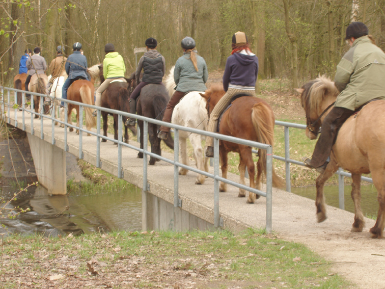 Onderweg, een smal bruggetje, groepsfoto na een rit, en dan effe rollen.